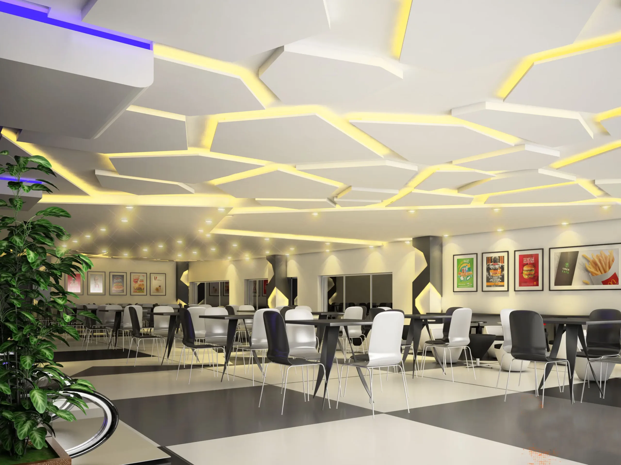 The building's design incorporates a mix of arches and rectangular windows, giving it a unique and visually appealing appearance. The presence of various brand logos on the exterior suggests that the building is a commercial hub, likely housing a range of retail and dining establishments.